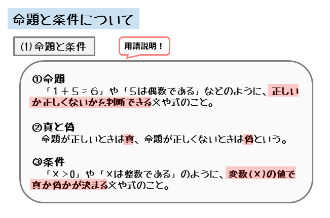 この単元では、命題・条件・否定という用語が出てきます。それぞれの定義をしっかり覚えましょう。