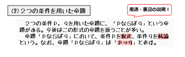 このような命題を一般に「pならばq」と言い、記号を使って「p⇒q」と表します。また、条件pを仮定、条件qを結論と言います。
