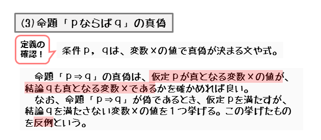 命題「pならばq(p⇒q)」の真偽を調べるとき、条件p,qが真となる変数の値を考えます。