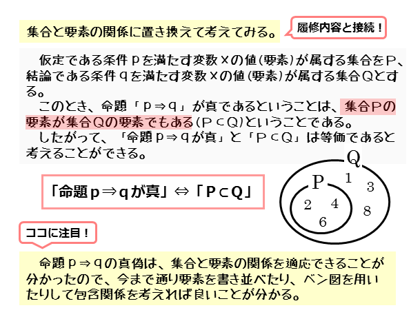 命題「pならばq(p⇒q)」が真であるとき、集合Pの要素は、集合Qの要素でもあります。つまり、集合Pは集合Qの部分集合となるので、「P⊂Q」が成り立ちます。