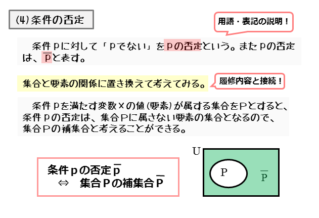 このことから「条件pの否定」と「集合Pの補集合」は等価(同値)であることが分かります。