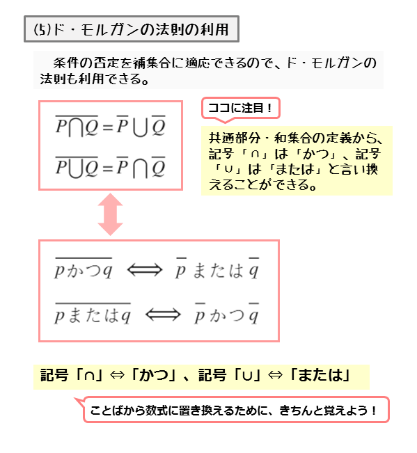 \begin{align*} \quad \overline{p \ \scriptsize{\text{かつ}} \ q} \ &= \ \overline{p} \ \scriptsize{\text{または}} \ \overline{q} \\[ 7pt ] \overline{p \ \scriptsize{\text{または}} \ q} \ &= \ \overline{p} \ \scriptsize{\text{かつ}} \ \overline{q} \end{align*}注意したいのは、記号とことばの対応関係です。共通部分の記号「⋂」は「かつ」に対応し、和集合の記号「⋃」は「または」に対応します。