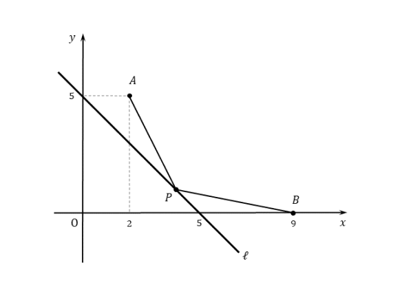 $A(2 \ , \ 5) \ , \ B(9 \ , \ 0)$ とするとき、直線 $x+y=5$ 上に点 $P$ をとり、$AP+PB$ を最小にする点 $P$ の座標を求めよ。