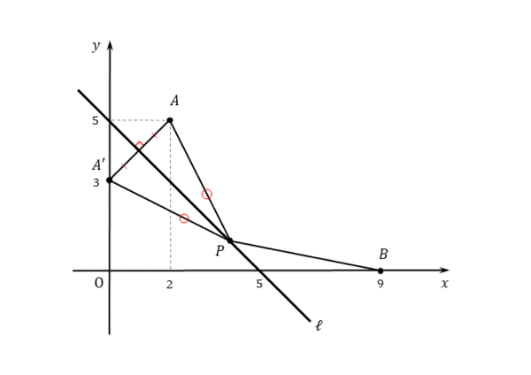- 直線A’Bと直線ℓの交点(点P)の座標を求める。