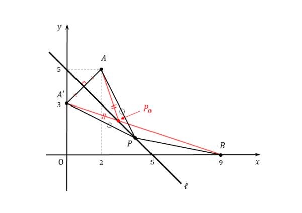 \begin{align*} \quad x+3y=9 \quad \cdots \text{④} \end{align*}直線 $A’B$ と直線ℓの交点を $P_{0}$ とすると、その座標は①,④を解いて