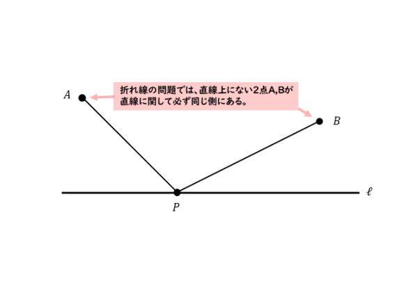折れ線のままで点Pの位置を考えるのはとても難しいです。折れ線になるのは、2点A,Bが直線に関して同じ側にあるからです。