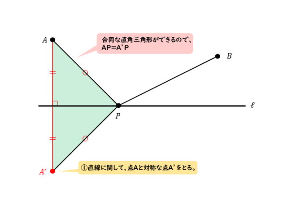 線分AA’,AP,A’Pによって三角形ができており、これが直線ℓによって二等分されています。