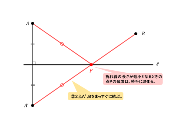 - 点Aと直線ℓに関して線対称な点A’をとり、点A’と点Bを線分で結んだ図を描いておく。