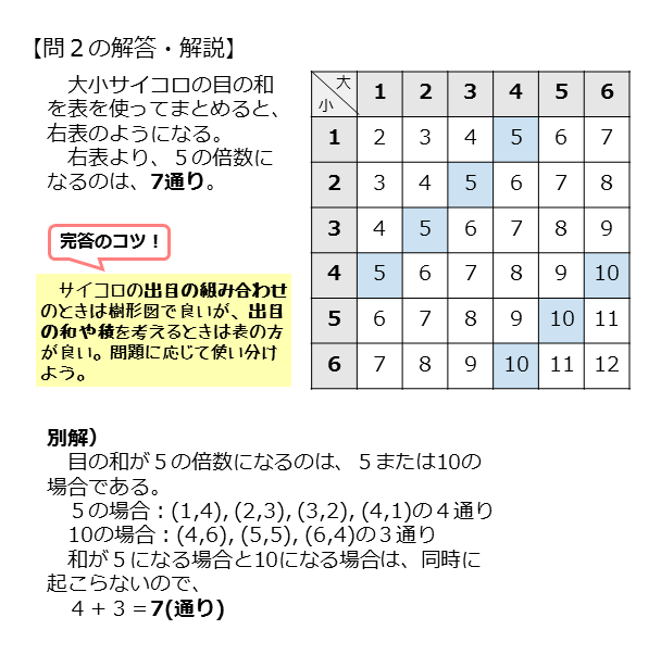 サイコロを扱った問題では、目の組合せ自体が必要であれば樹形図だけも足りるでしょう。しかし、目の和や積であれば、樹形図よりも一覧表の方が使い勝手が良いでしょう。
