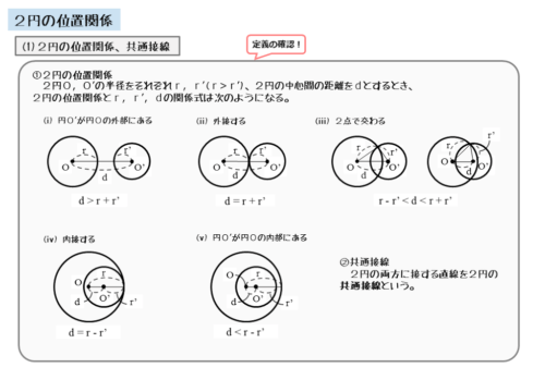 2円の位置関係によって、2円の中心間距離と2円の半径との関係が変わるので注意しましょう。作図しながら考えるとよく分かります。