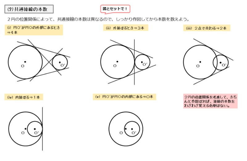 また、共通接線と円との共有点(接点)と、2つの円の共有点(交点)を混同しないようにしましょう。何と何の共有点なのかを把握しましょう。図示すれば間違うことはないので、必ず図を見て確認しましょう。