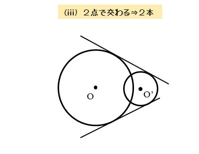 2円O,O’が2点で交わるので、2円は共有点を2個もちます。また、円と共通接線の共有点(接点)は、それぞれの円上にあります。