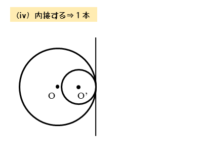 2円O,O’が内接するとき、図のように共通接線を引けます。このとき、1本の共通接線を引くことができます。