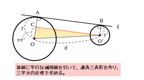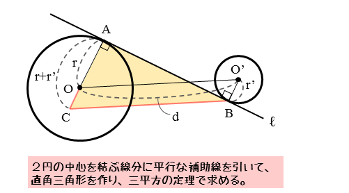 このとき、接点間の距離である線分ABの長さを、r,r’,dを用いて表してみましょう。