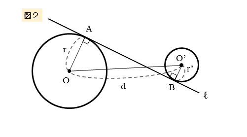 2つ目のパターンは、図2のように、共通接線との接点が異なる側(図ではAが上側、Bが下側)にある図形です。