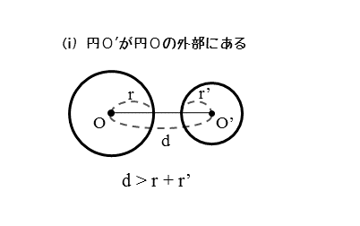 円O’が円Oの外部にあるとき、図から分かるように、中心間距離dは、2円の半径の和(r+r’)よりも大きくなります。このときの関係を不等式で表すと以下のようになります。