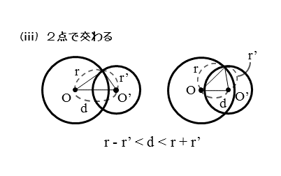 2円O,O’が2点で交わるとき、図から分かるように、中心間距離dは、2円の半径の和(r+r’)よりも小さくなり、2円の半径の差|r-r’|よりも大きくなります。