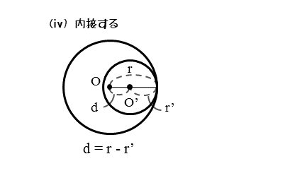 2円O,O’が内接するとき、図から分かるように、中心間距離dは、2円の半径の差|r-r’|に等しくなります。このときの関係を不等式で表すと以下のようになります。