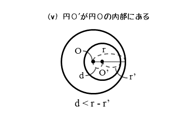 \begin{align*} \quad d &\cdots \text{$2$ 円の中心間距離} \\[ 5pt ] r &\cdots \text{円 $O$ の半径} \\[ 5pt ] r’ &\cdots \text{円 $O’$ の半径} \end{align*}円O’が円Oの内部にあるとき