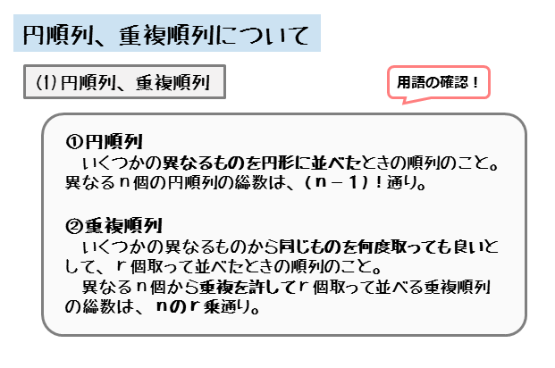 今回は円順列や重複順列について学習しましょう。どのような場合に円順列や重複順列になるのかをしっかり覚えましょう。