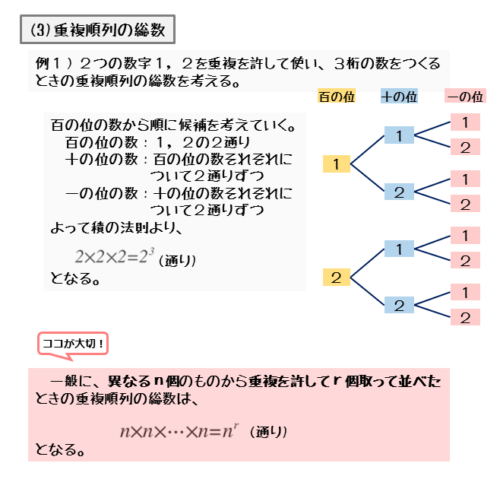 積の法則が成り立つことが分かるので、3桁の数の作り方は2×2×2=23通りになります。このことは異なるn個のものから重複を許す場合でも成り立ちます。