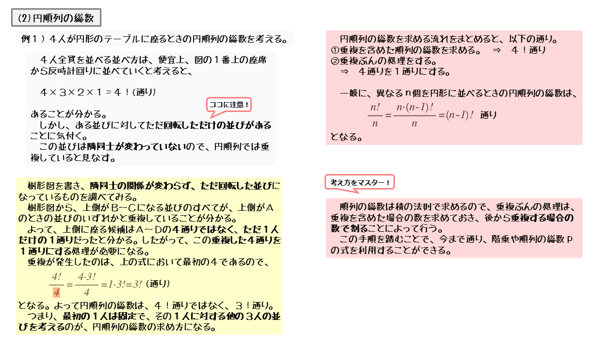 \begin{align*} \quad \frac{n!}{n} &= \frac{n \cdot (n-1) \cdot (n-2) \cdot \cdots \cdot 1}{n} \\[ 10pt ] &= (n-1) \cdot (n-2) \cdot \cdots \cdot 1 \\[ 10pt ] &= (n-1)! \end{align*}円順列の総数とその考え方をまとめると以下のようになります。