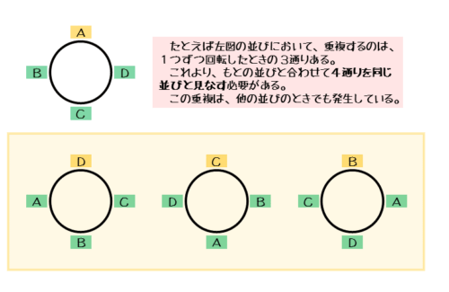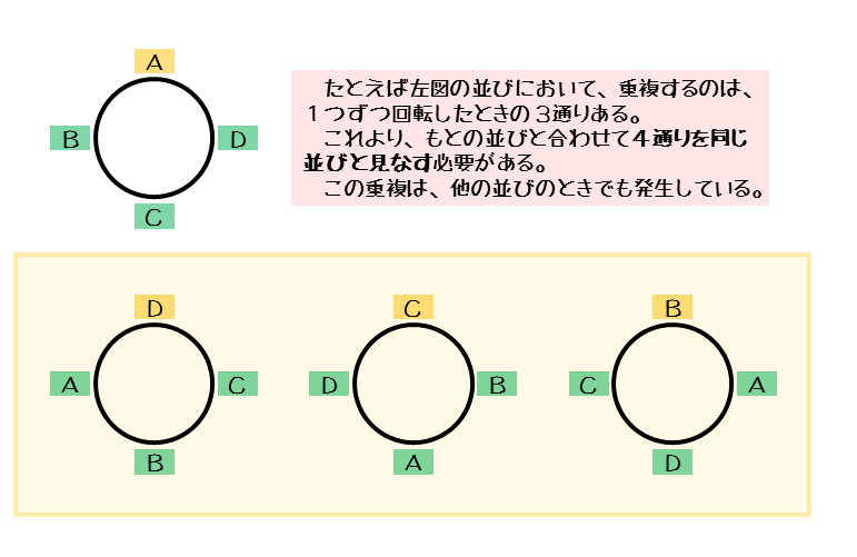 このとき「A,B,C,D」の並びと同じ座り方と見なせるのは、「D,A,B,C」「C,D,A,B」「B,C,D,A」の並びです。これより、「A,B,C,D」の並びは全部で4通りあるので、重複を除くためにこれらを1通りと見なす必要があります。