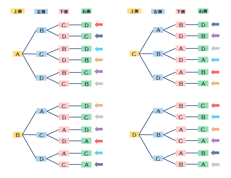 - 6時の位置から反時計回りにA,B,C,Dが座る場合