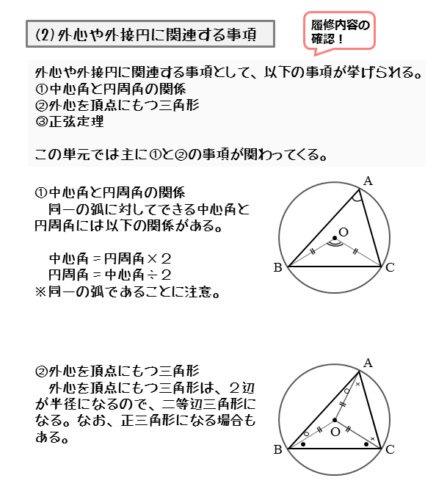 外心や外接円と関わりのある事柄は主に3つあります。外心や外接円を扱った問題のパターンと考えても良いかもしれません。