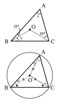 \begin{align*} \quad x &= \angle BAC \\[ 7pt ] &= \angle {OAB}+\angle {OAC} \\[ 7pt ] &= 20^{\circ}+30^{\circ} \\[ 7pt ] &= 50^{\circ} \end{align*}次に角yを求めます。角yは、二等辺三角形である△OBCの底角です。△OBCの底角を求めるには、∠BOCを求めておく必要があります。