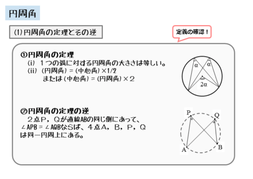 円周角の定理は、中学で既に学習しましたが、次の2つの事柄が成り立つ定理です。