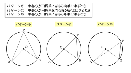 円周角∠APBができる位置は、点Pの位置によって異なります。中心Oの位置に注目して、3通りのパターンに場合分けして証明します。