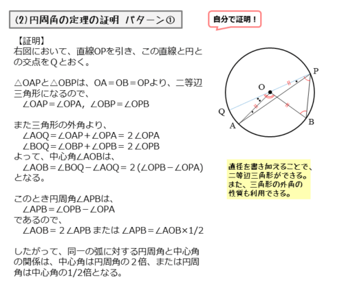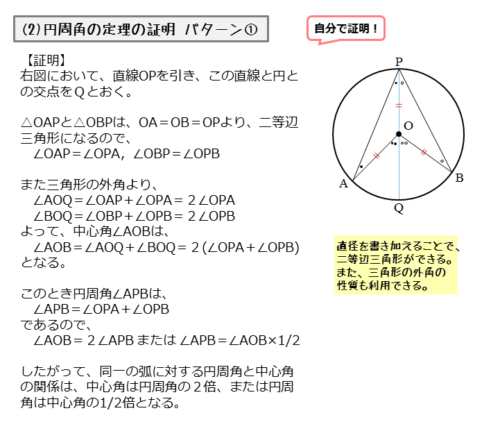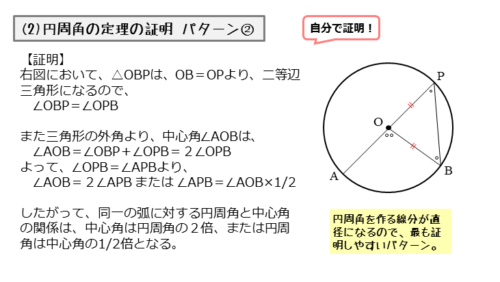 どのパターンでも二等辺三角形を上手に利用しています。二等辺三角形があれば、底角や外角を利用して、円周角と中心角の関係を導出することができます。