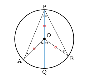 直線OPを引いたことで、線分OA,OB,OPは半径に等しくなりました。