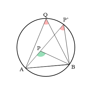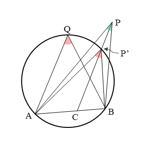 点Pが△ABQの外接円の周上にあれば、円周角の定理より、∠APB=∠AQB が成り立つのは明らかです。