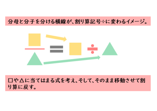 割り算に戻すときのコツは、分母と分子を分ける横線を意識することです。横線よりも下のカタマリが分母で、横線よりも上のカタマリが分子です。