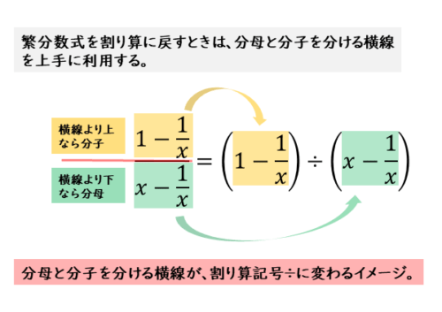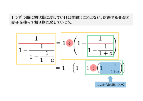 このように複雑な繁分数式を割り算に戻す場合、外側の分数式から順に割り算に戻していくとミスを防ぐことができます。