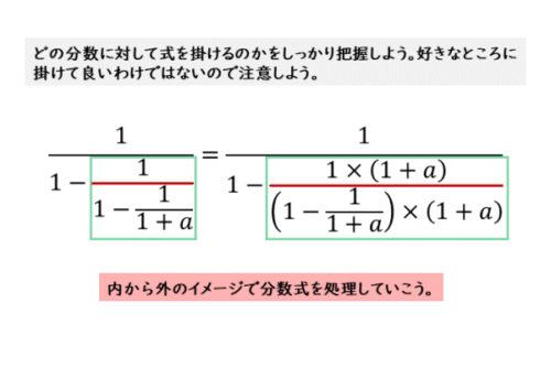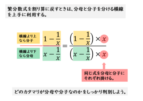繁分数式は、複雑な見た目をしているので、その扱いが難しそうな印象を受けます。しかし、決まった対処法があるので、それに従って扱えば問題ありません。