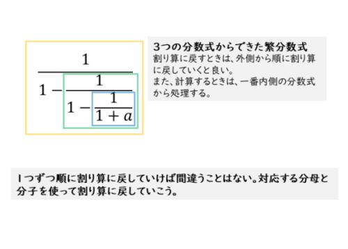 \cfrac{1}{1-\cfrac{1}{1-\cfrac{1}{1+a}}} &= 1 \div \left[ 1- \left\{ 1 \div \left( 1 – \frac{1}{1+a} \right) \right\} \right] \quad \text{(通分して1つの分数式にする)} \\[ 15pt ]