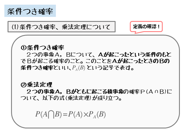 \begin{align*} \quad P \left( A \cap B \right) = P(A) \times P_{A} \left( B \right) \end{align*}式や記号を見れば、条件つき確率PA(B)と積事象が起こる確率P(A⋂B)とが異なるものだと分かります。
