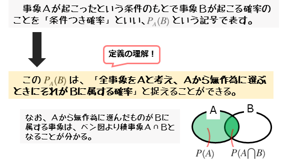 事象Aが起こったという条件のもとで事象Bが起こる確率のことを条件つき確率PA(B)と言います。この「事象Aが起こったという条件のもと」の部分がポイントです。