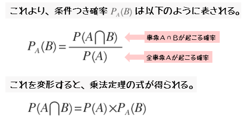 また、2つの事象A,Bがともに起こる積事象の確率P(A⋂B)は、Aが起こる確率P(A)とAが起こったという条件のもとでBが起こる条件つき確率PA(B)との積で表されます。これを乗法定理と言います。