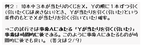 X,Yの2人が順番にくじを引くので、2つの試行には時間的に順番がついています。しかし、事象Aに相当するのは、Yが当たりを引く(引いた)事象です。これは、2回目の試行における事象です。