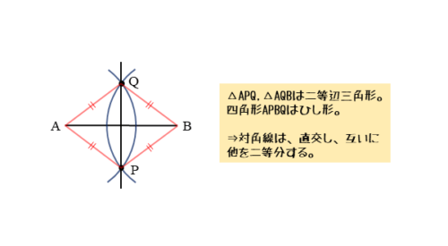AP=BP=AQ=BQとなるように作図したので、△APBと△AQBは合同な二等辺三角形になります。また、四角形APBQはひし形になります。