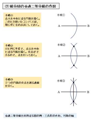 垂直二等分線を作図するような状況として、たとえば、外心や線対称の軸を作図するときに利用されます。このことは「軌跡」の単元でも出題されるので覚えておきましょう。