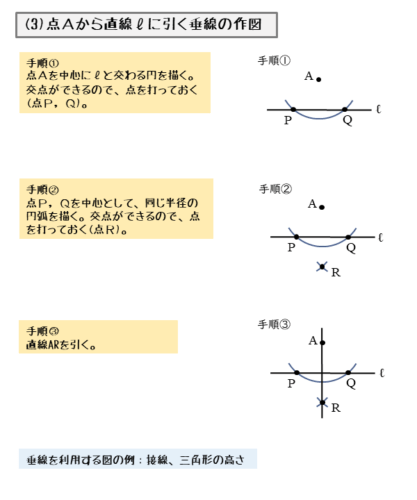 点Aを通る直線ARが、直線ℓに対して垂直であることは、2つの直線AR,ℓがひし形である四角形APRQの対角線であることから明らかです。このような垂線は、たとえば、接線や三角形の高さを作図するときに利用されます。