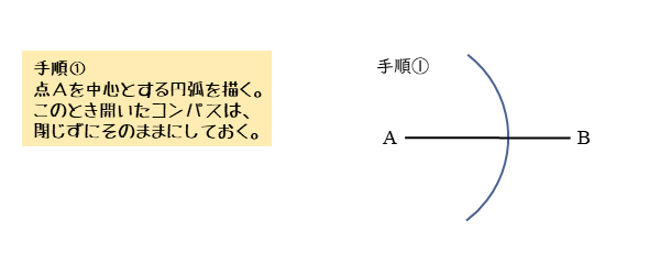 コンパスの開き具合いは、線分ABの半分よりも大きくなるようにしましょう。また、この後も同じ半径の円(弧)を描くので、コンパスを閉じずに開いたままにしておきます。