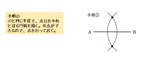 点Aを中心とする円(弧)と、点Bを中心とする円(弧)が交わって、線分ABの上下に交点が2つできます。交点だと分かるように、点を打っておくと良いでしょう。