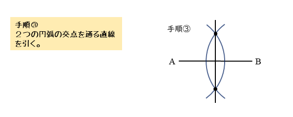 2つの交点を通る直線を定規を使って引きます。これが線分ABの垂直二等分線です。