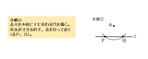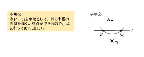 手順①と同じ要領でコンパスを使って、今度は点P,Qをそれぞれ中心とする円(弧)を描きます。このとき、直線ℓに関して点Aと反対側に円(弧)を描きます。